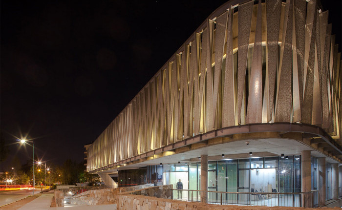 El proyecto “Edificio Comunitario” para la Municipalidad de Vitacura se ubica al borde del río Mapocho, incorporando una conexión con la naturaleza. De igual manera, cobra relevancia la cercanía del imponente macizo formado por el cerro Manquehue y Manquehue Chico, lo que determina la búsqueda de vistas desde los interiores hacia el privilegiado entorno natural. Estudiamos un edificio discreto en cuanto a su altura, así como una casa, y con esto buscamos cuidar su relación con los edificios vecinos haciendo que sea un aporte a la armonía natural y arquitectónica del sector. Se plantea una doble piel mediante una lámina de aluminio plegada y perforada que permita filtrar el sol sin producir un efecto de encierro por el interior. Esta piel se ha colocado en forma de “volumen”, y girada respecto de su eje. El giro se realiza en sentido opuesto a la trayectoria solar, de tal forma que el edificio es más opaco en las orientaciones con mayor soleamiento facilitando el sombreamiento de los cristales de fachada, haciéndose más transparente en el resto de las orientaciones permitiendo integrar las vistas del entorno. El edificio está rodeado de patios que facilitan la ventilación natural, introduciendo sombra y vegetación, lo cual produce una disminución de temperatura empujando el aire caliente hacia arriba a través de la fachada refrescando la envolvente. Se contempla la utilización de paneles fotovoltaicos en parte de la cubierta. La energía captada se acumula en baterías y se utiliza como apoyo a la iluminación del edificio, que contempla la utilización de iluminación de bajo consumo.
