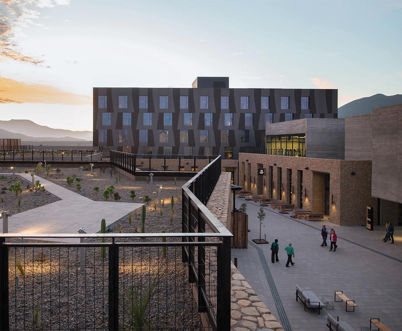 A 3 kms. del centro de la ciudad de Ovalle se encuentra el Casino y Hotel Ovalle, fundando una ciudadela en medio del valle de Limarí. Al igual que los antiguos habitantes del valle se asentaban al interior de las cárcavas, esta ciudadela pretende constituirse como una grieta en el lugar, buscando dar refugio a través de sus recovecos, los que a su vez generan una secuencia de espacios interiores y exteriores que esconden al tráfico exterior y las vías, promoviendo la calma y el descanso. Una gran pirca de piedra perimetral delimita el espacio habitable de esta nueva ciudad. Sobre ella descansan los volúmenes que albergan las distintas partes del programa formando una planta cuadrada, que se corta en sentido diagonal cárcava, formando así la grieta central en la que converge el programa. Cada volumen y su respectiva forma acusa de algún modo muy sutil lo que pasa al interior. El casino y salón de eventos forman en conjunto una gran caja de un solo piso, a la cual se accede desde dos puntos opuestos que sobre su techo tiene un gran jardín botánico donde se exponen las principales especies de cactus de la región. El hotel se destaca por su revestimiento metálico inspirado en la cultura diaguita y su forma geométrica emulando una greca. Al fondo de la cárcava se sitúa el museo Diaguita, un gran monolito cúbico seccionado por rajaduras de luz. Entre los espacios destacados del proyecto está el casino y salón de eventos, que forman en conjunto una gran caja de un solo piso. Los muros enchapados en piedra del lugar dan un sentido vernacular propio del clima de la región, haciendo alusión a las paredes rocosas de las cárcavas del valle del Limarí.